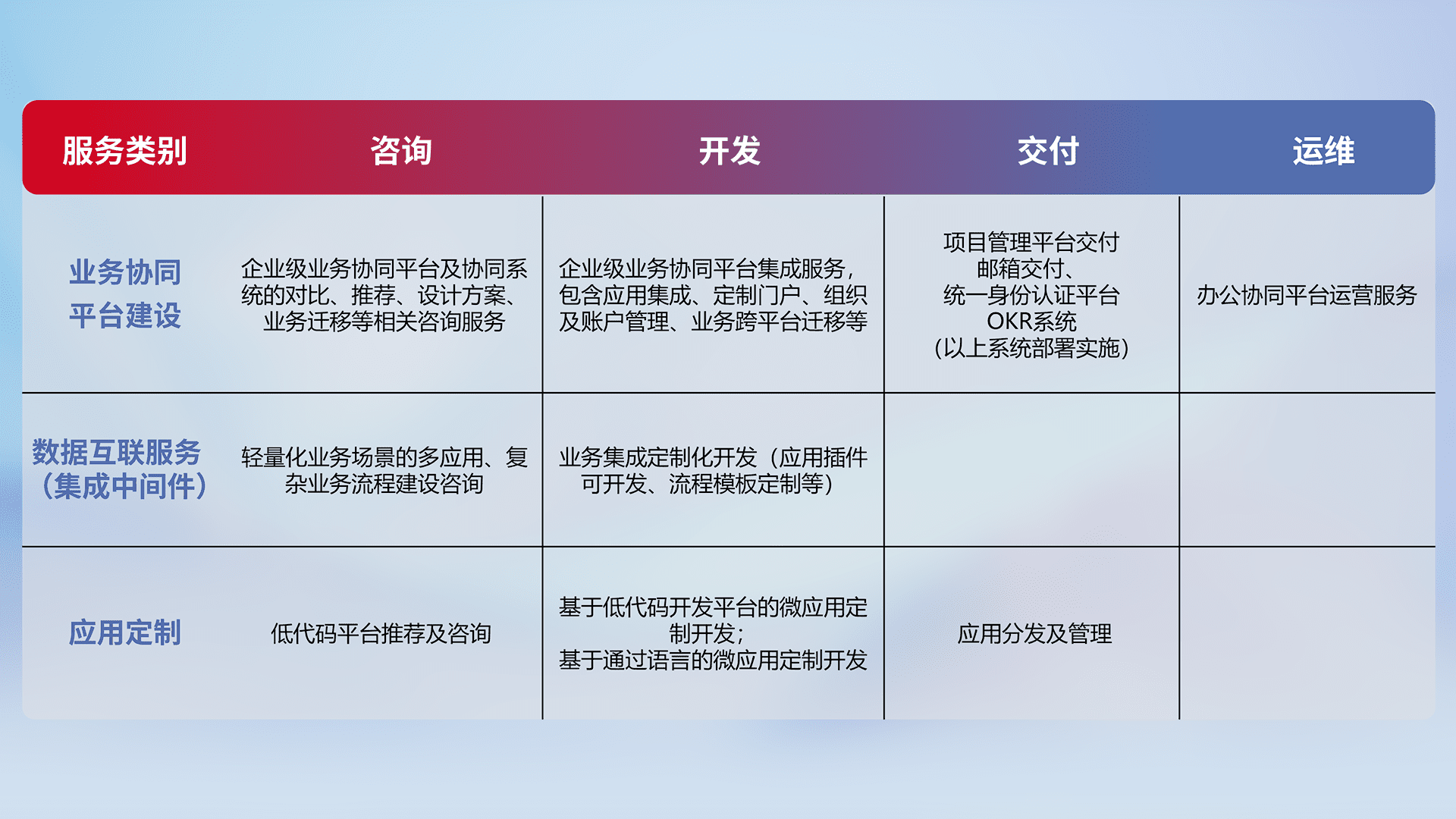 针对钉钉、、、、企微、、、IDaas等平台级产品提供产品的规划、、、方案、、、交付、、、定制化开发等服务,,实现如统一协同办公、、、、智能客户服务、、混合会议管理、、智能数据查询、、、等业务场景,,,实现数字化转型。。。。