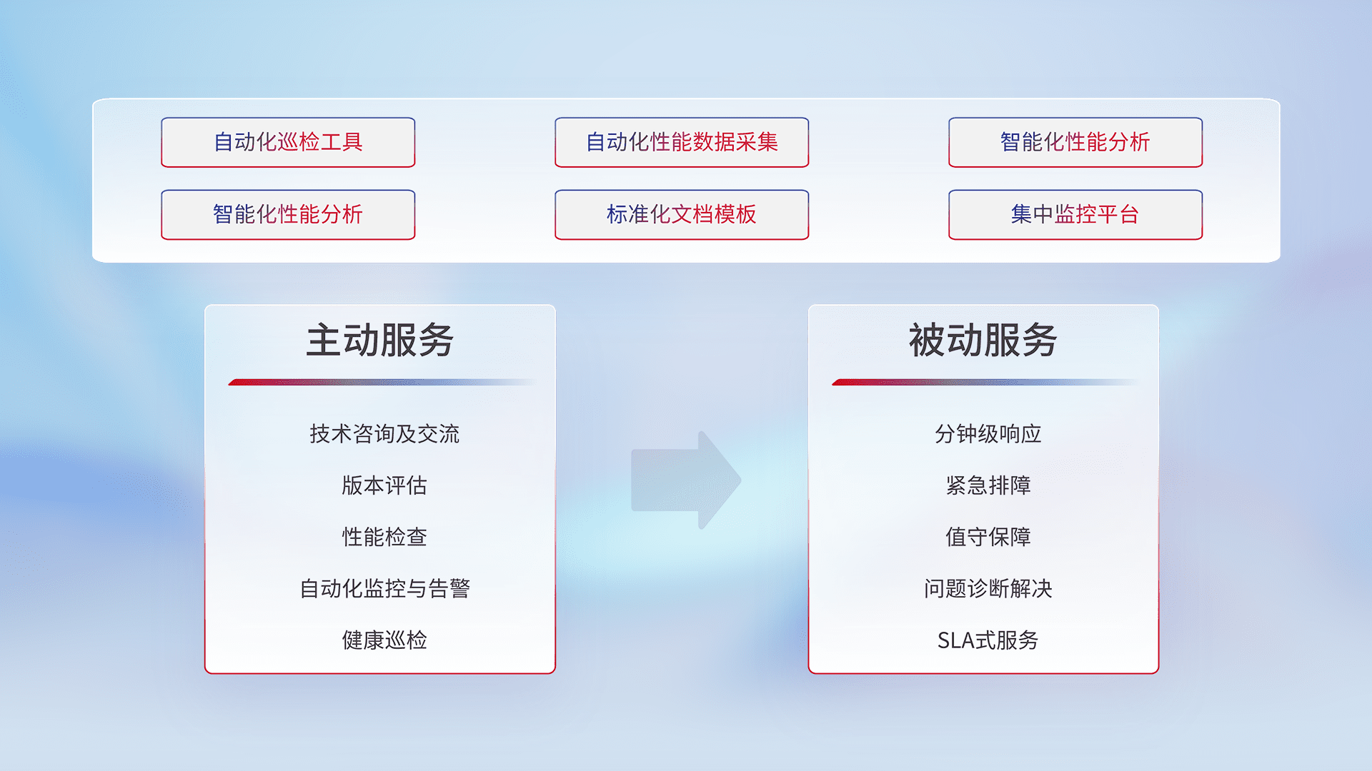 智能化工具和标准化文档,,,,保障服务质量,,,,提供主动服务(包含技术咨询、、、版本评估、、性能检查、、、自动化监控与告警、、、、健康巡检)和被动服务包含(分钟级响应、、、紧急排障、、、、值守保障、、、、问题诊断解决、、、、SLA服务)。。。。